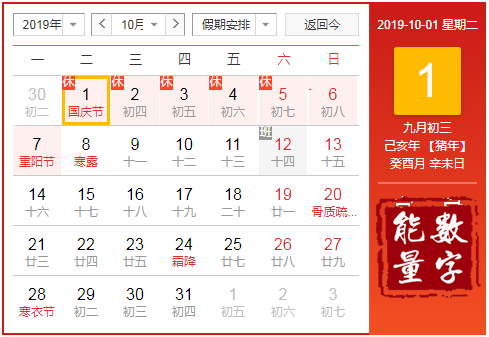 1、放假时间:2019年10月1日(星期二)~5日(星期六) 为期五天。