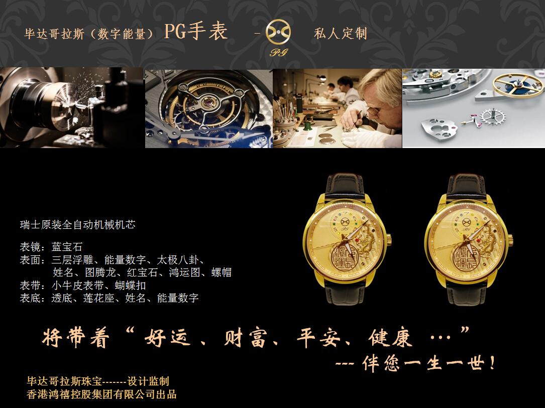 毕达哥拉斯(数字能量)PG手表 ----- 是根据您的姓名,出生年月日,身份证号码,依据毕达哥拉斯数字能量理论和周易文化理论,推算出您的生命数字密码、五行运程、相生六合、健康、财富 … 等诸多幸运元素而定制的永恒时间记录载体。